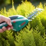 Универсална, лека и удобна акумулаторна ножица за трева и за храсти. Удобна ръкохватка с меко противоплъзгащо покритие. Индикация на състоянието на акумулатора. Практичен четиристепенен светодиод с актуална индикация на заредеността на акумулатора. Отлична ергономия. Вграден 3,6 V литиево-йонен акумулатор. Голяма продължителност на работа до 50 мин. Без саморазреждане, без Memory-ефект. SDS технология за бърза и лесна смяна на ножовете. Изрязани с лазер качествени ножове за прецизно рязане. Реже без прекъсване до 600 линейни метра. Електронната система „Anti-Blocking” осигурява непрекъснато рязане. 004394