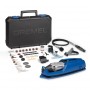 Този комплект на Dremel включва високопроизводителния мултифункционален инструмент 4000 с новата приставка EZ с извит връх. Това означава, че вече не е необходим гаечен ключ за смяна на консумативи. Комплектът се доставя в добре организирана кутия, която включва подвижна табличка за консумативи и държач за инструменти, който може да се закрепи към стената и позволява лесно навиване на кабела на инструмента. Това практично куфарче съдържа също приставка гъвкав вал, приставка за успоредно рязане и рязане по окръжност, ръкохватка за прецизна работа и профилираща стойка. Освен това са включени 65 оригинални консуматива на Dremel. 136DRM334