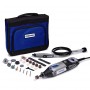 Този комплект включва високопроизводителния мултифункционален инструмент 4000 с иновационни (характеристики) отличителни белези, като приставка EZ с извит връх, електронна обратна връзка, функция за блокировка на цангата и диапазон на оборотите от 5000 до 35000 об./мин. В допълнение, комплектът включва приставката гъвкав вал, която е идеалната за прецизна обработка на детайли в трудно достъпни места. Наред с гъвкавия вал комплектът включва 45 оригинални консуматива Dremel, включително EZ SpeedClic. 136DRM260