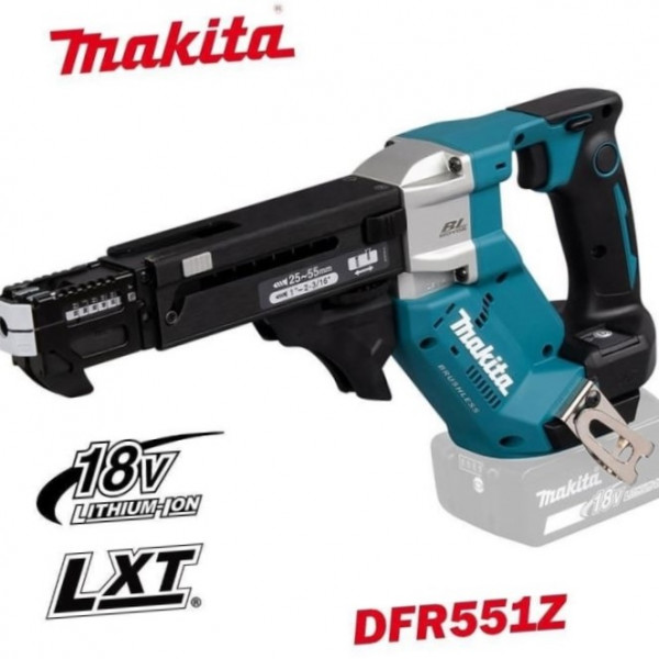 Makita DFR551Z e автоматичен акумулаторен винтоверт за завиване на винтове с размери 4x25-55 мм в гипсокартон. Обрудван е с високоефективен безчетков мотор, който се захранва от 18 V батерия и осигурява максимална скорост без товар 6000 об./мин. Захватът е шестостен 1/4". Бутонът за реверс може да се натиска с една ръка, а ръкохватката е ергономична за максимално удобство по време на работа. В зависимост от използваните винтове, ограничителя за дълбочина на завинтване се регулира лесно без допълнителни инструменти. Има безшумен съединител, който осигурява по-висока ефективност, с директна трансмисия при реверс. Сгъваемият водач предпазва лентата с винтове от прегъване и осигурява по-лесно транспортиране на инструмента. Доставя се без батерия и зарядно устройство.