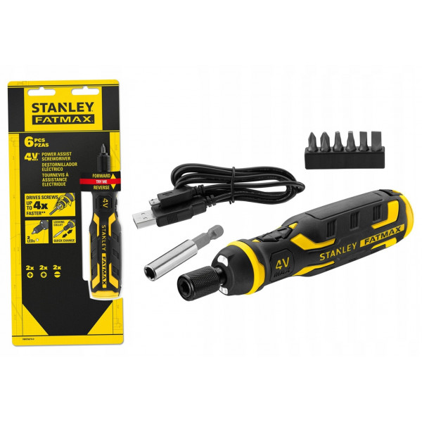 Акумулаторната отвертка Stanley FatMax се захранва от вградена 4 V батерия с капацитет 1.5 Ah, която осигурява максимална скорост 300 об./мин за до 4 пъти по-бързо от ръчното завинтване. Максималният й въртящ момент е 0.9 Nm. Побира се добре в ръката и може лесно да се носи в джоб или кутия с инструменти. Оптимизирана е за достъп до тесни пространства и има удобна двукомпонентна ръкохватка. Разполага с интегриран магнитен държач за битове и функция реверс. Захранва се чрез USB кабел, като трицветен диод показва текущото състояние на зареждане. Доставя се с USB кабел за зареждане и битове PH1, PH2, PZ1, PZ2, SB4 и SB 5.5.