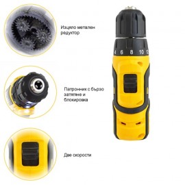 Висок въртящ момент. Тристепенен индикатор за капацитет на батерията. Спусък с потенциометър - тип „Чувствителен спусък“. Патронник с блокировка и бързо заключване. Двускоростен, изцяло метален редуктор. Функция „пробиване със свредло“. Електродвигател произведен в Япония. Вградено LED осветление. Солиден гумиран корпус, отлично балансиран. Време за зареждане на батерията - 60 мин.