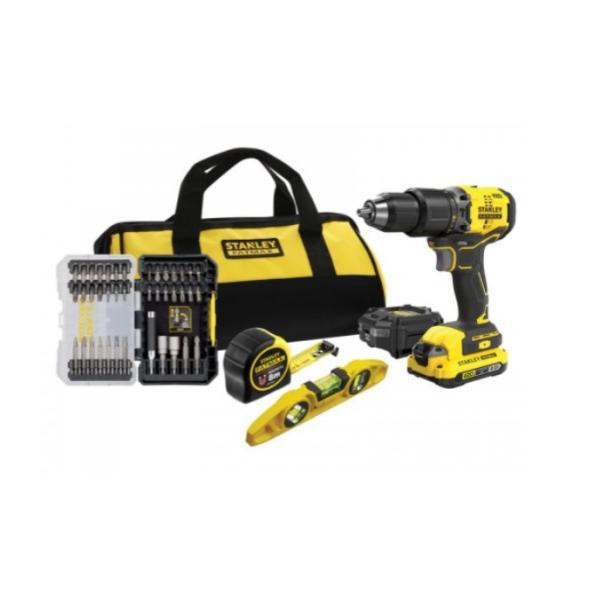 Акумулаторният ударен винтоверт Stanley SFMCD715 e оборудван с мощен безчетков мотор, който се захранва от 18 V батерия от новата серия V20 и осигурява максимален въртящ момент 60 Nm, максимална честота на ударите 32 300 уд./мин и скорост 0-600/0-1900 об./мин за ефективно пробиване и завинтване в зидария, дърво, метал и пластмаса. Въртящият момент може да се регулира в 15 степени. Винтовертът разполага с безключов патронник за лесна смяна на работния инструмент, 2-степенна скоростна кутия и вградена LED работна светлина за подобрена видимост на работната зона. Доставя се в текстилна чанта с 1 батерия 18 V, 2 Ah, зарядно устройство, нивелир, пластмасова ролетка с дължина 8 м и комплект от 40 бита в здрава пластмасова кутия.
